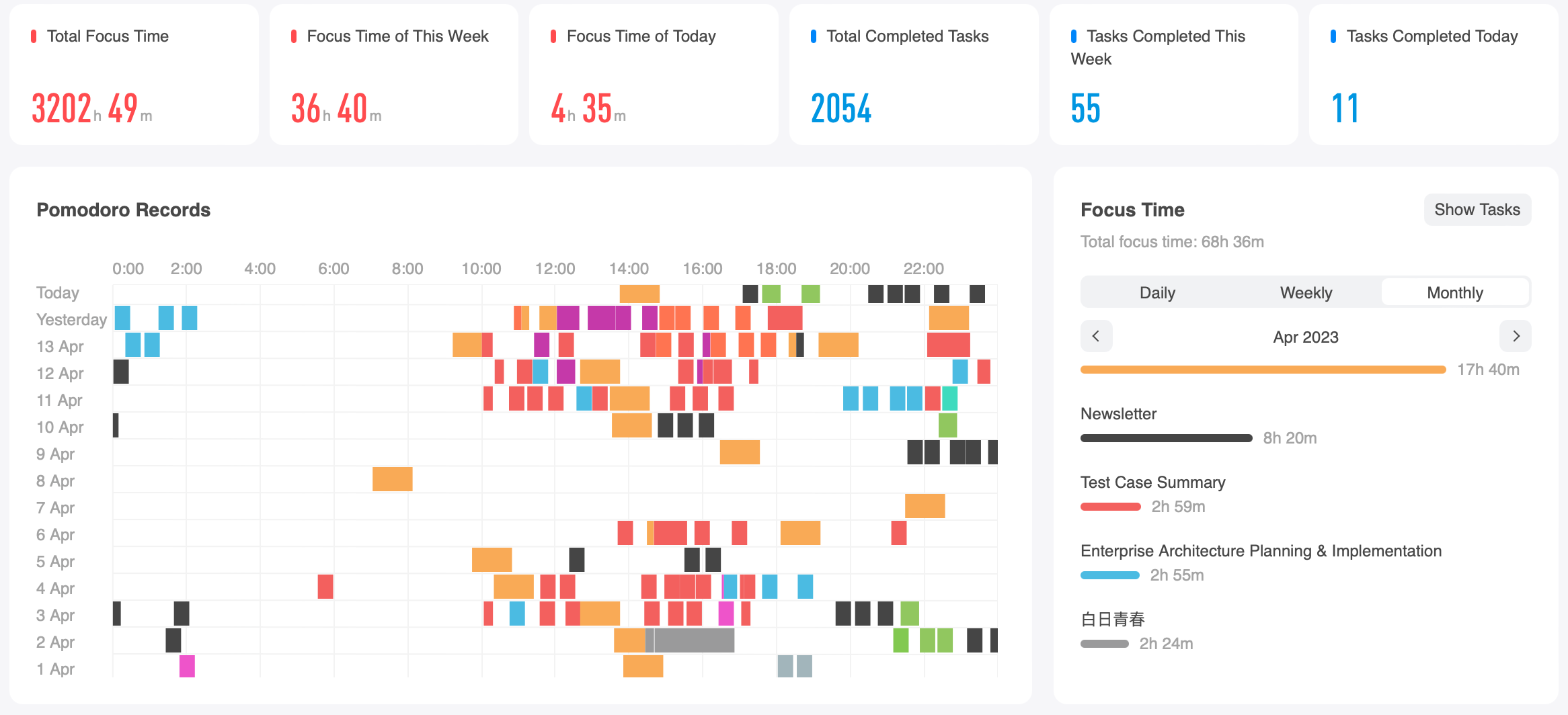 I have been using the Focus To-Do List app for more than 2 years, and I highly recommend it to my friends who want to increase their productivity. (I am currently using their premium version which cost me roughly 100 HKD for lifetime access to more advanced features like folders). We talked about in the newsletter how the second brain helped to provide greater clarity to our lives, while this app is perfect for tracking the amount of time you spend on different tasks throughout the day. It's super easy to use and intuitive. The app applies the Pomodoro technique, which means you focus for 25 minutes and then rest for 5 minutes. This has helped me to get much more productive at work.